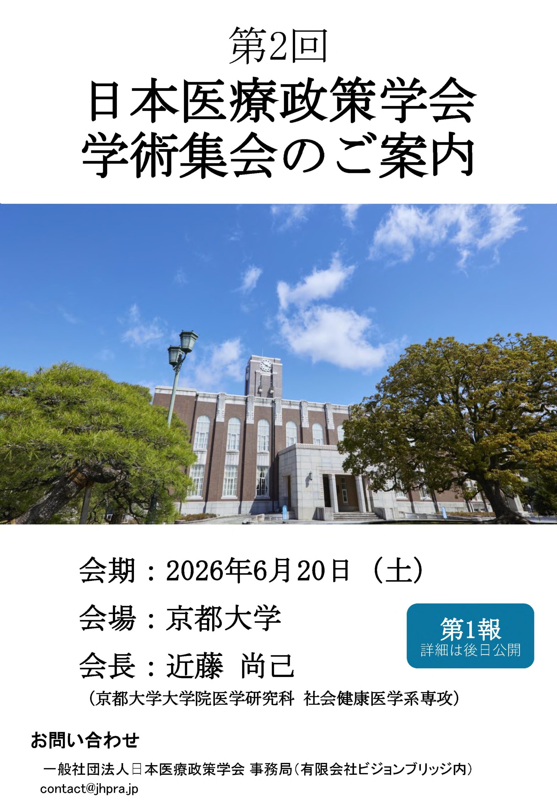 日本医療政策学会 第2回学術集会 I.第2回学術集会 期 日: 2026年6月20日(土) 会 場: 京都大学 ※詳細は後日公開いたします。 お問い合わせ先 〒162-0833 東京都新宿区箪笥町 (たんすまち) 43 新神楽坂ビル2階 ⽇本医療政策学会 事務局(有限会社ビジョンブリッジ内) E-mail: contact@jhpra.jp ホームページ: https://jhpra.jp/
